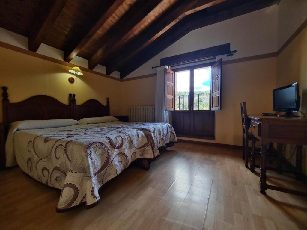El hostal cuenta con habitaciones decoradas en un estilo rústico con toques modernos, disponen de conexión a Internet, televisión, teléfono y baño privado con secador de pelo. Los huéspedes pueden disfrutar de platos típicos de la región, como migas y setas de temporada, en su popular restaurante o relajarse en su terraza al aire libre. El establecimiento también ofrece servicios como recepción, lavandería, salas de reuniones, y cuenta con la comodidad de un parking privado dentro del recinto